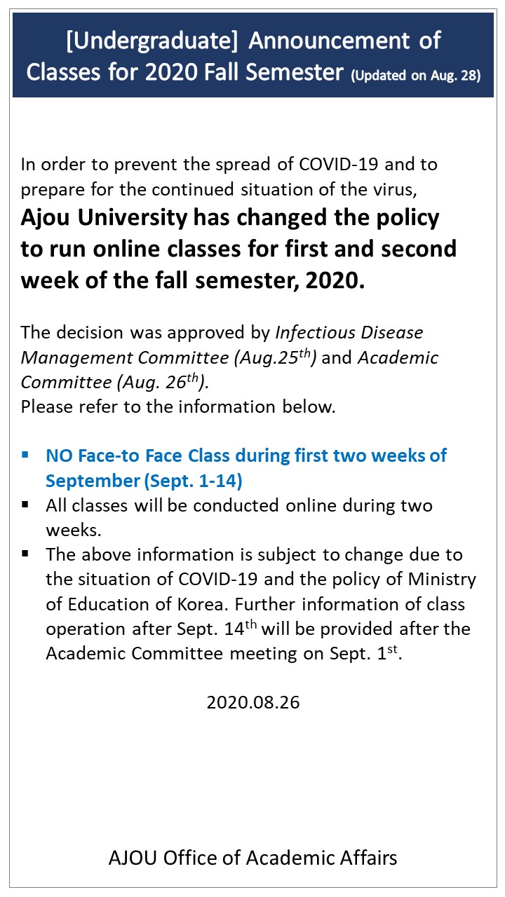 [Academic Affairs] [Undergraduate] Announcement of Classes for 2020 Fall semester (As of Aug. 26th)
