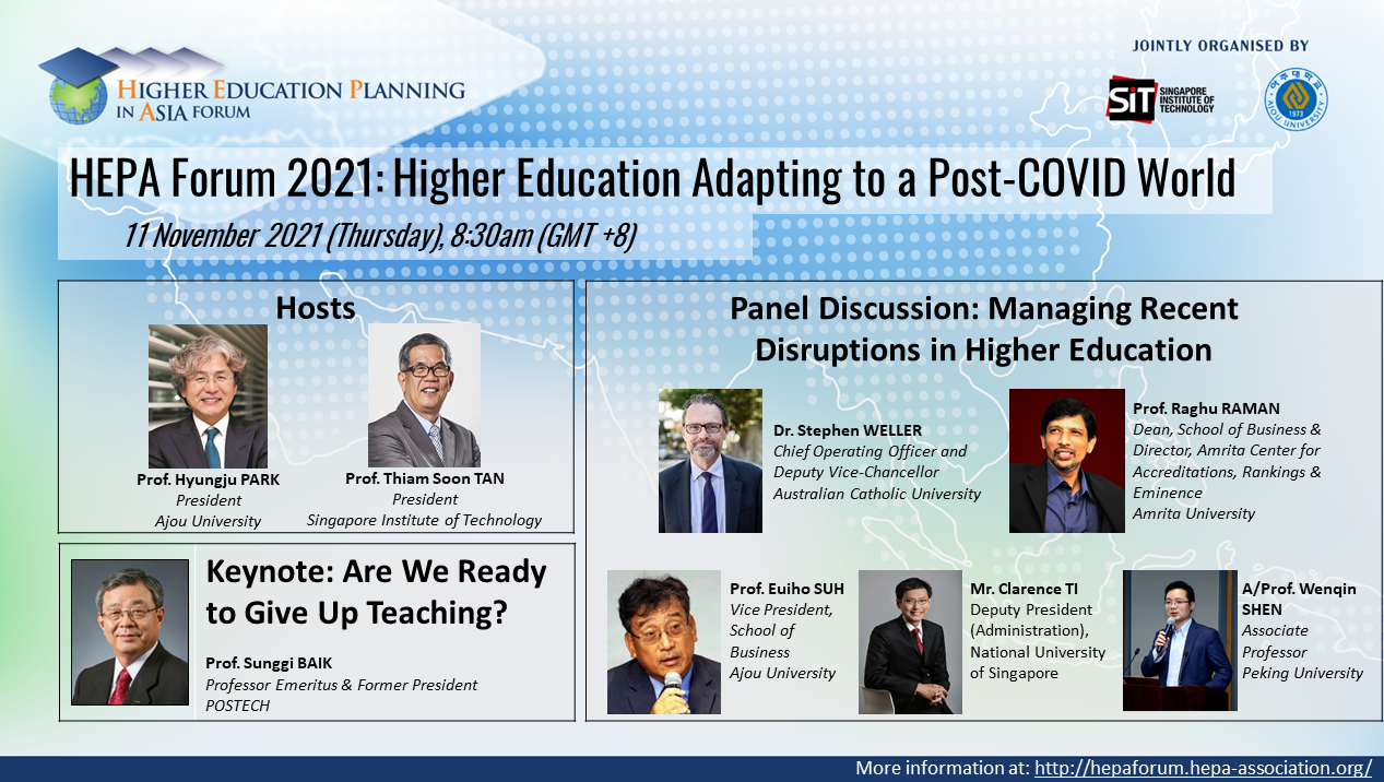 Greetings from Ajou University, Korea.  We would like to cordially invite you and members of your institutions to attend the Higher Education Planning in Asia Forum 2021 co-hosted by Ajou University, Korea and Singapore Institute of Technology, Singapore themed “HIGHER EDUCATION ADAPTING TO A POST-COVID WORLD”.