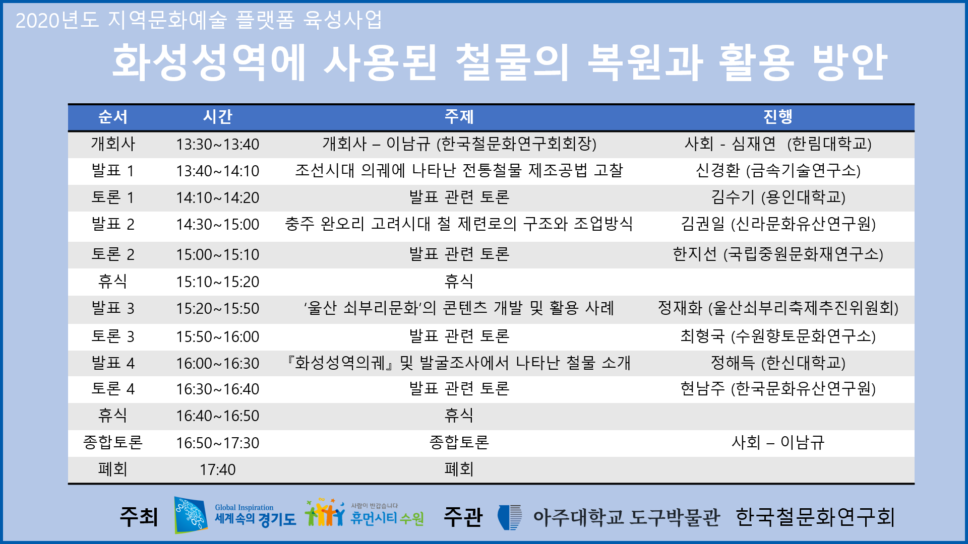 * 해당 학술 세미나는 잠정 연기 되었으며, 추후 재 공지 하도록 하겠습니다.- 사유 : 최근 급속한 코로나 19 감염 확산과 관련함.아주대학교 도구박물관은 2020년도 지역문화예술 플랫폼 육성사업으로화성성역에 사용된 철물의 복원과 활용방안에 대해 학술세미나를 진행합니다.한국철문화연구회와 함께 화성 성역에 사용된 철물을 조사하고, 전통제철 기술을 기반으로 철물을 복원한 다음 이를 지역 문화 콘텐츠로 개발하는 방법을 모색하였습니다.또한 이를 바탕으로 제철복원 실험을 추후 진행할 예정입니다.이에, 아래와 같이 학술 세미나를 진행하오니 많은 관심 바랍니다.- 일정 : 8월 28일 14시~18시 (연기됨)- 시청 방법 : 유튜브에서 "아주대학교 도구박물관" 검색- 내용1) 1 발표 - 충주 완오리 고려시대 철 제련로의 구조와 조업방식 / 14:10~14:40 - 발표자 : 김권일 (신라문화유산연구원)2) 토론 / 14:40~14:50 - 토론자 : 한지선 (국립중원문화재연구소)3) 2 발표 - 조선시대 의궤에 나타난 전통철물 제조 공법 고찰 / 14:50~15:20 - 발표자 : 신경환 ( 금속기술연구소)4) 토론 / 15:20~15:30 - 토론자 : 김수기 (용인대학교)5) 3 발표 - 울산쇠부리문화의 콘텐츠 개발 및 활용 사례 / 15:30~16:00 - 발표자 : 정재화 (울산쇠부리축제추진위원회)6) 토론 / 16:00~16:10 - 토론자 : 최형국 (수원향토문화연구소)7) 4 발표 - 화성성역의궤 및 발굴조사에서 나타난 철물 소개 / 16:10~16:40 - 발표자 : 정해득 (한신대학교)8) 토론 / 16:40~16:50 - 토론자 : 현남주 (한국문화유산연구원)9) 종합토론 / 17:00~18:00 - 토론자 : 이남규 (한신대학교)