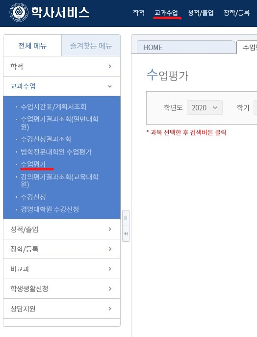 4단계: 수강과목목록에서 수업평가 실시할 과목 선택